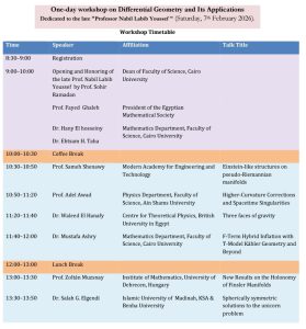 تقام الندوة في مدرج 10 بقسم الرياضيات بالكلية، خلال الفترة من الساعة التاسعة صباحا وحتى السادسة مساءا، وهى مهداة لذكرى عالم الهندسة التفاضلية، الراحل بكلية العلوم جامعة القاهرة، الأستاذ الدكتور نبيل لبيب يوسف، والذي رحل عن عالمنا في شهر مارس الماضي.